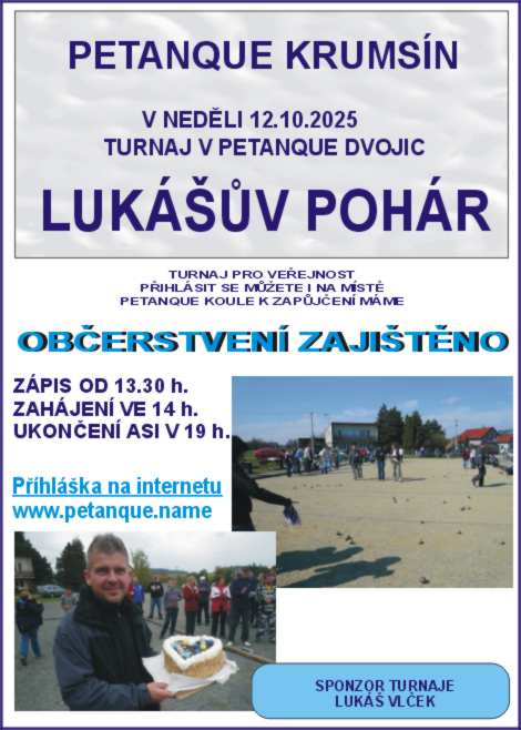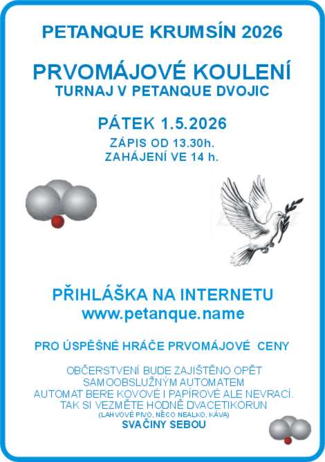 Od Velikonoční neděle opět v Krumsíně hrajeme tréninkové turnaje v petanque pro širokou veřejnost. Každý kdo přijde si může zahrát. I ti co petanque nehráli si můžou přímo na hřišti půjčit koule a hrát. Ruzpis turnajů v Krumsíně v roce 2023